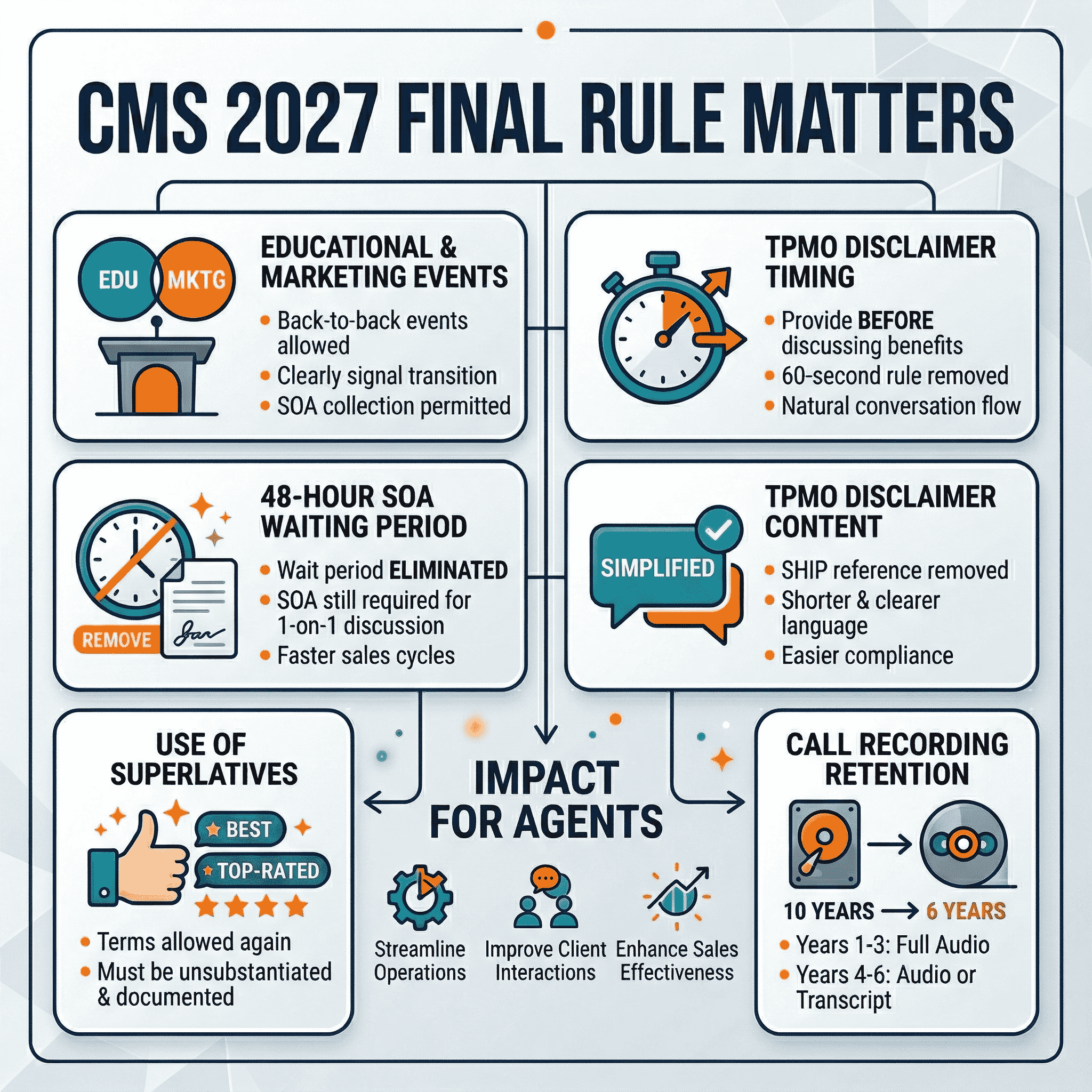 CMS is making a shift, and honestly, it’s one that needed to happen. The 2027 Final Rule cuts through some of the clutter so agents can spend less time dealing with process and more time doing what actually matters – helping people make the right decisions. With a streamlined Scope of Appointment and simplified call recording requirements, there’s less busywork and more opportunity to focus on guiding clients the right way. Practically speaking, this is where staying informed becomes critical. Regulations change, and if you’re not keeping up, that’s where mistakes happen. The agents who take the time to understand these updates are the ones who stay compliant and continue to grow. If you want the full picture, go straight to the source and review the official CMS breakdown so you’re not missing anything important . Bottom line: less red tape, more client focus, and a better way to run your business based on doing right by the people you serve.